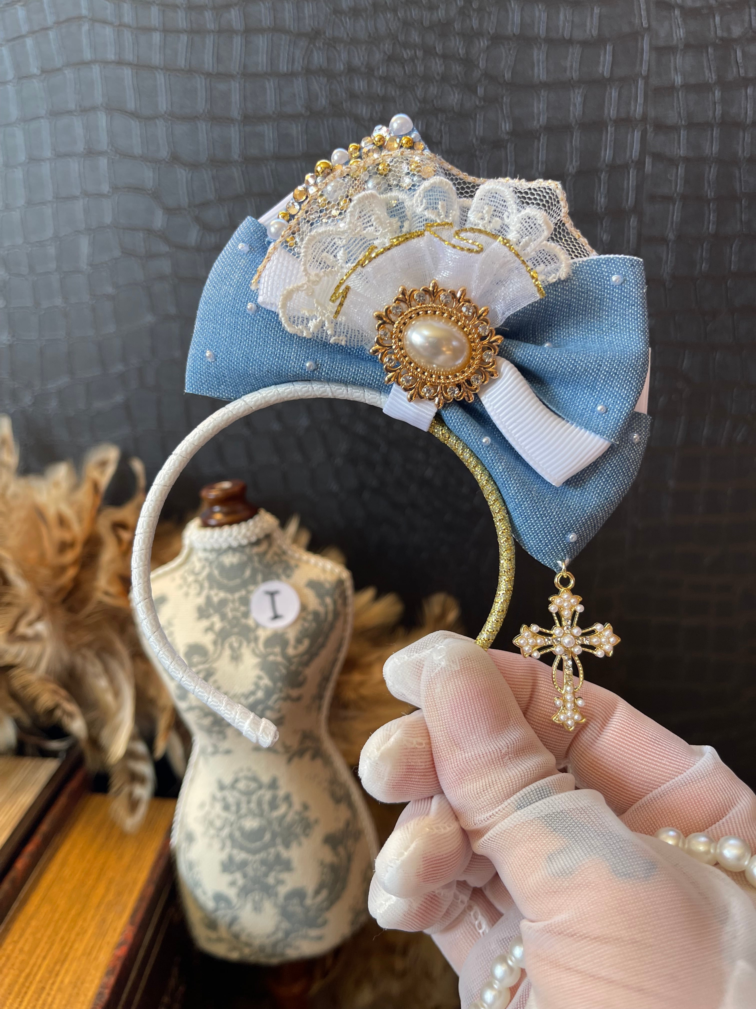 ※リボンカチューシャの(写真)右下にジュエリーチャームやレースなどを付けるオリジナルの下がりデザインです。