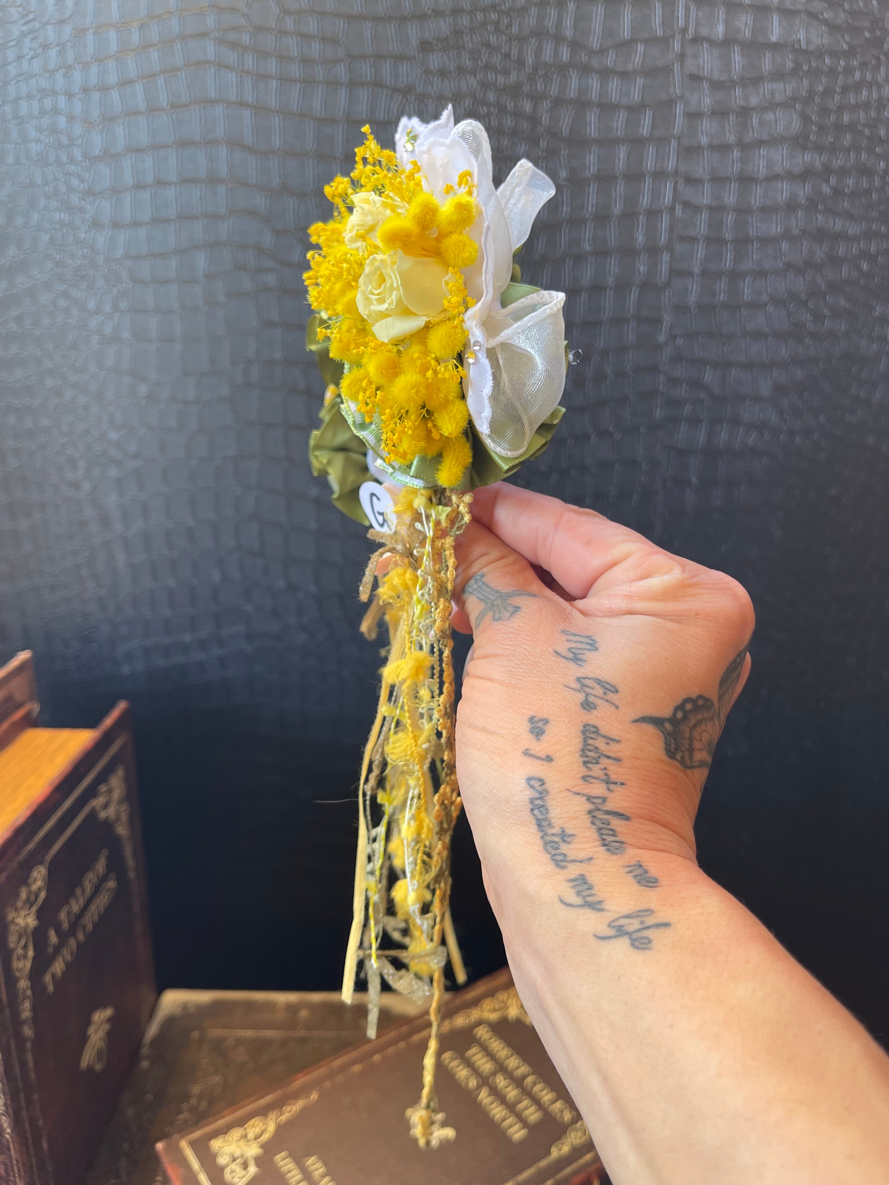 ミモザイエローに合うモスグリーンを背景に