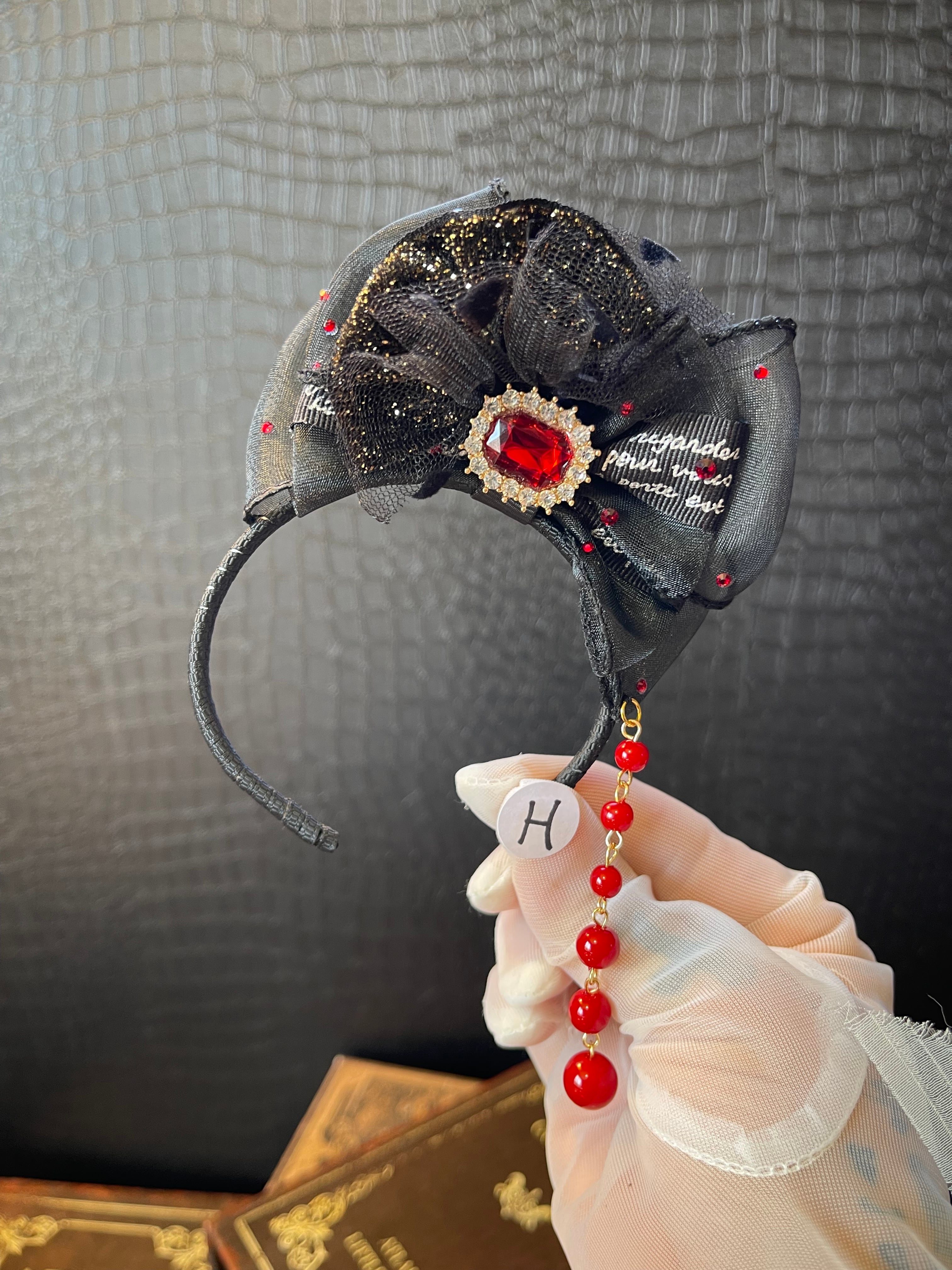 ※リボンカチューシャの(写真)右下にジュエリーチャームやレースなどを付けるオリジナルの下がりデザインです。