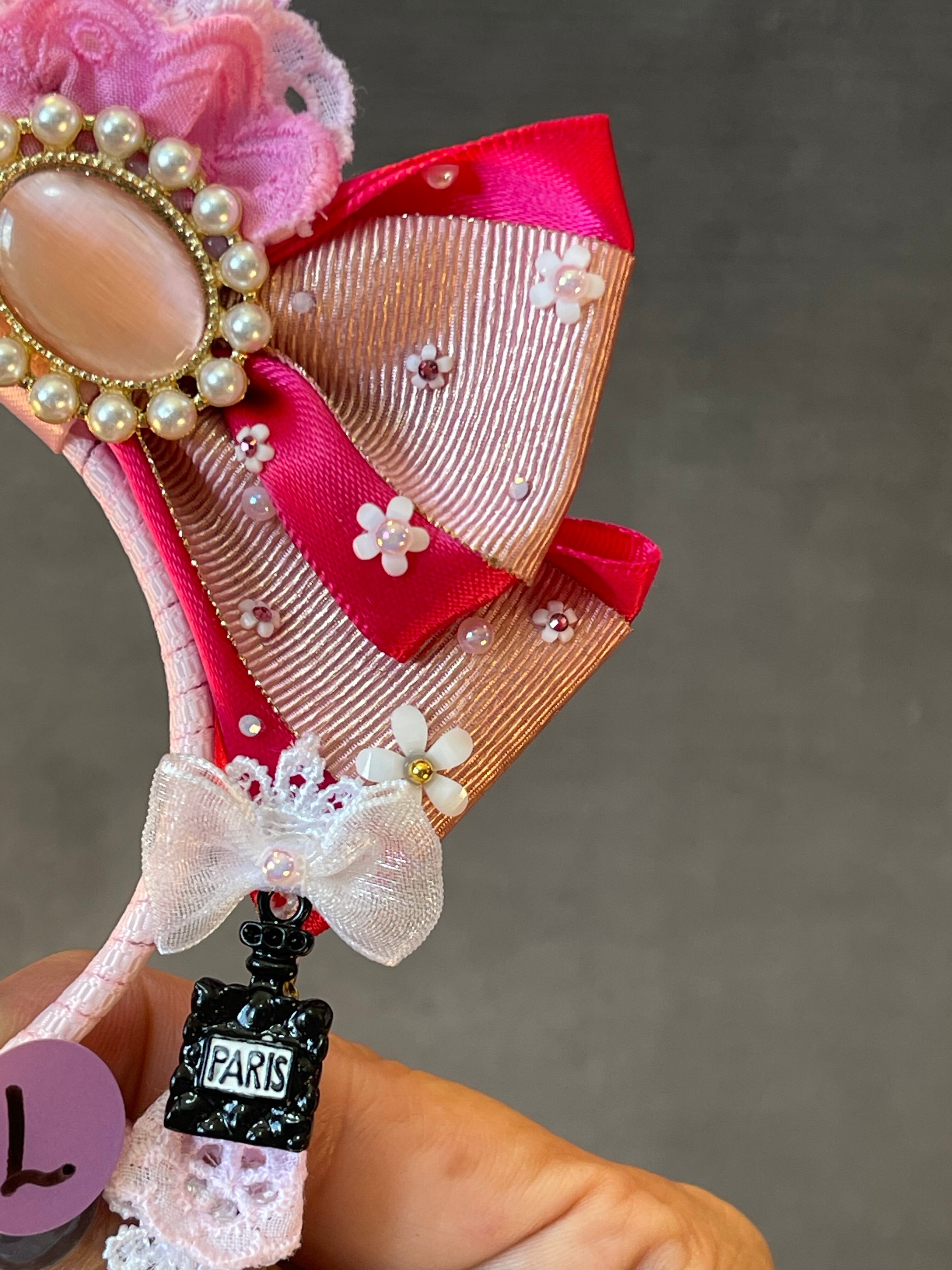 ※リボンカチューシャの(写真)右下にジュエリーチャームやレースなどを付けるオリジナルの下がりデザインです。