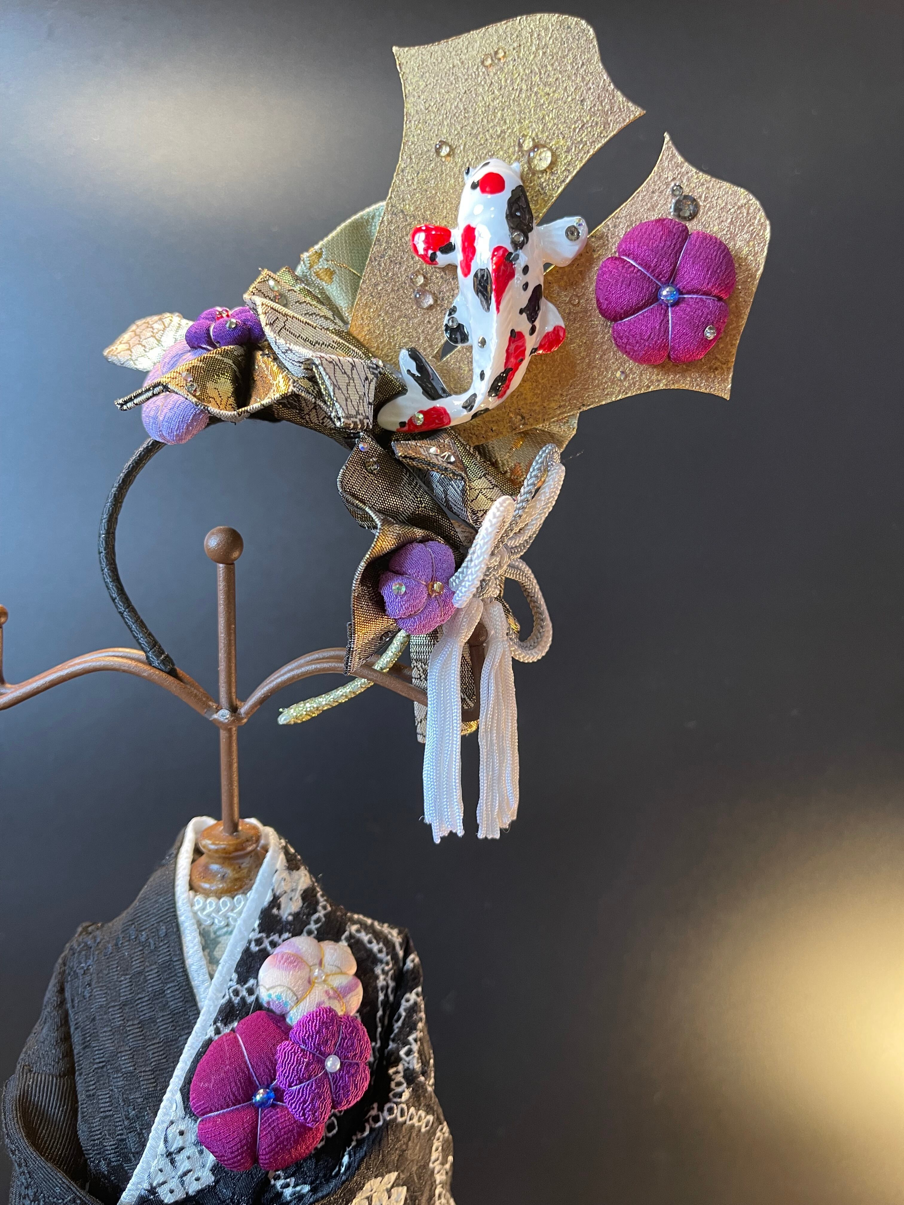 帯生地を折り込み、色んな素材を盛りながら