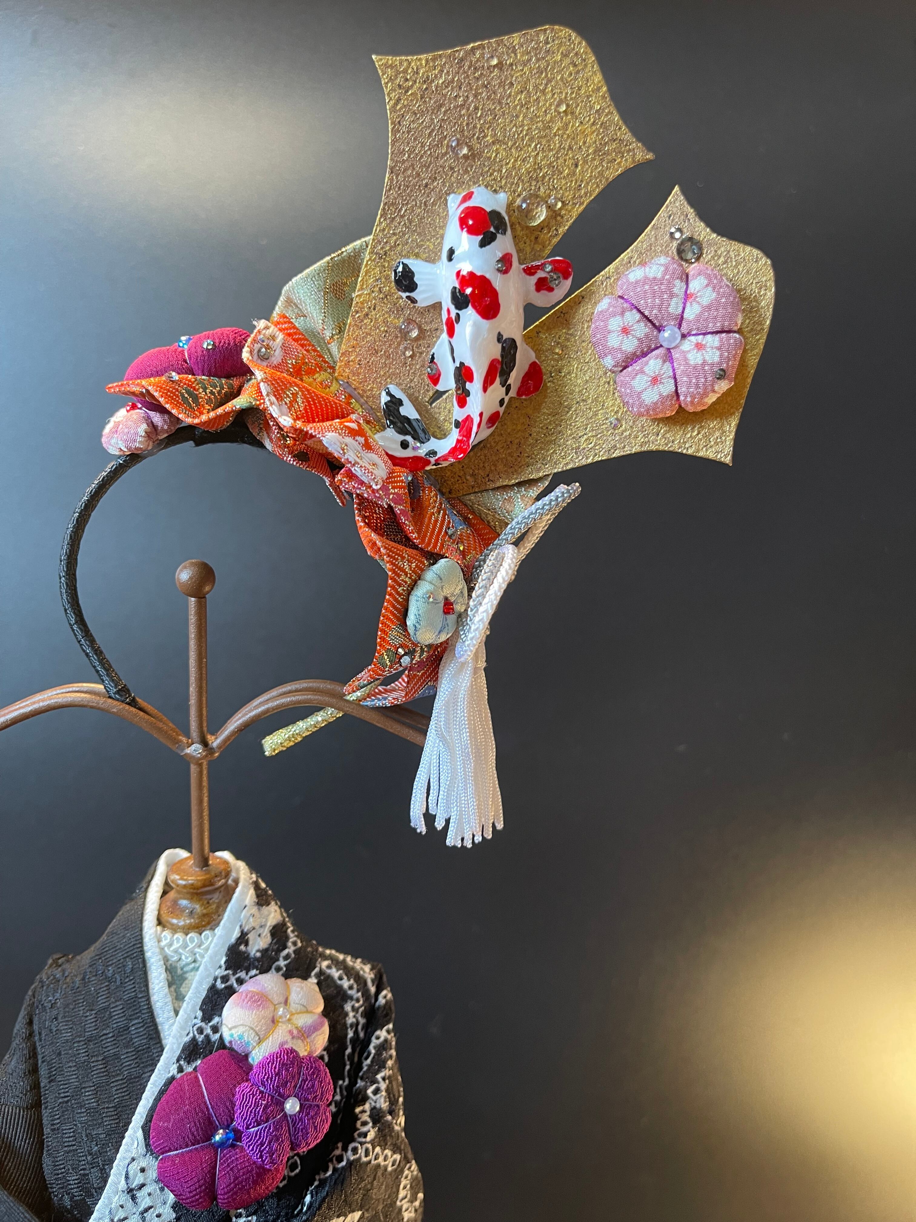帯生地を折り込み、色んな素材を盛りながら